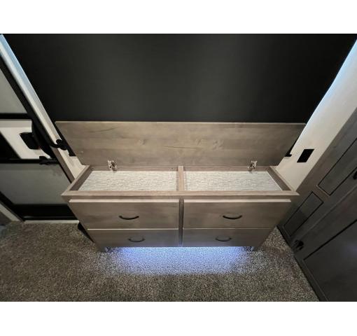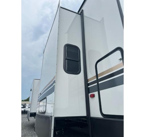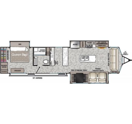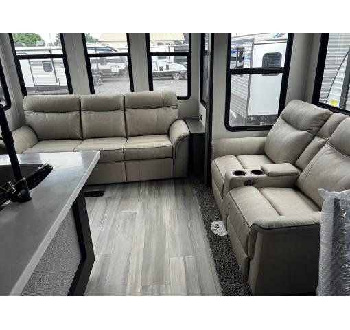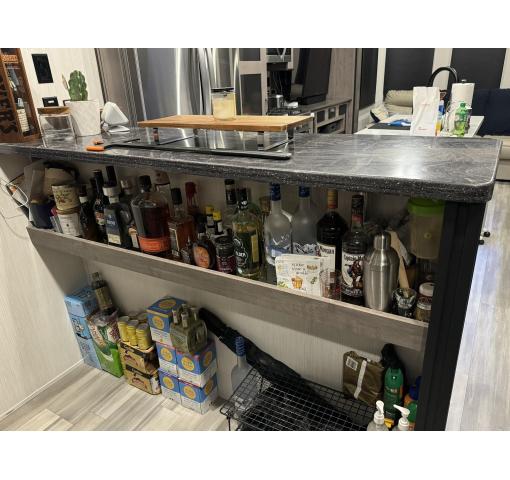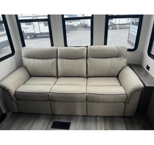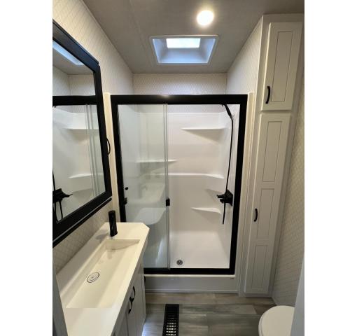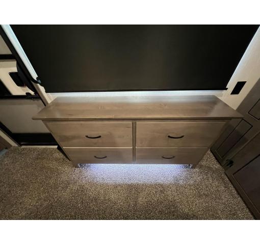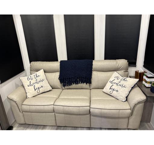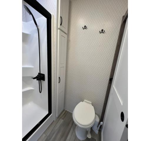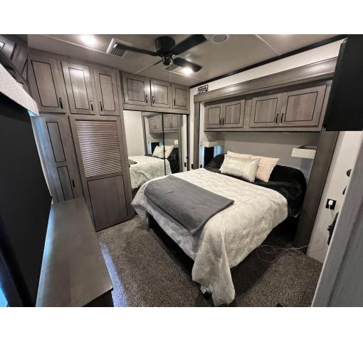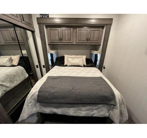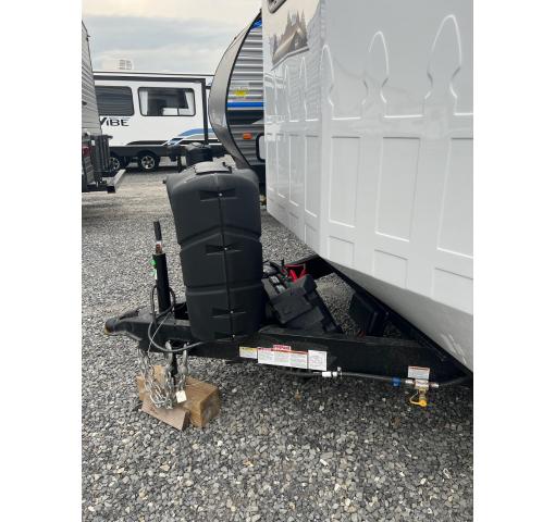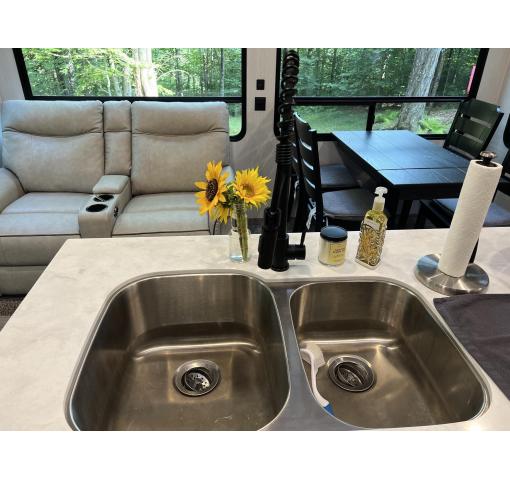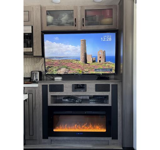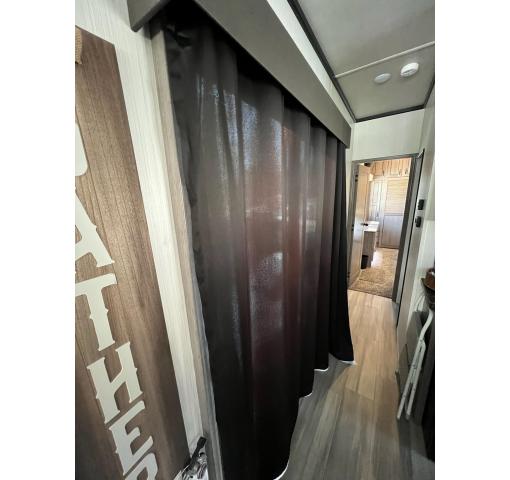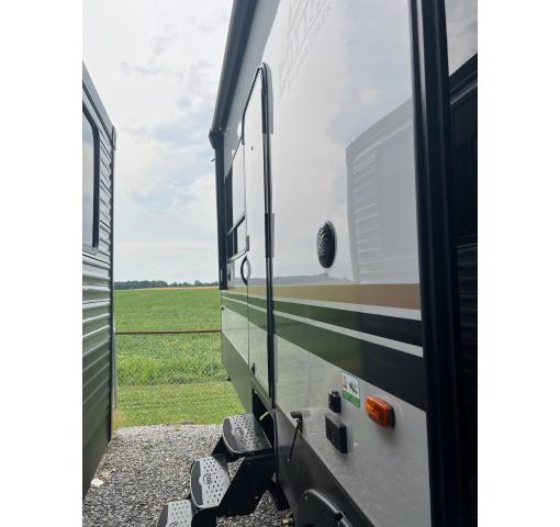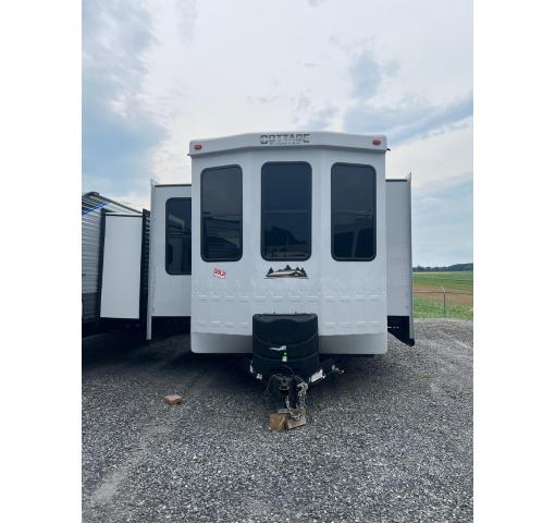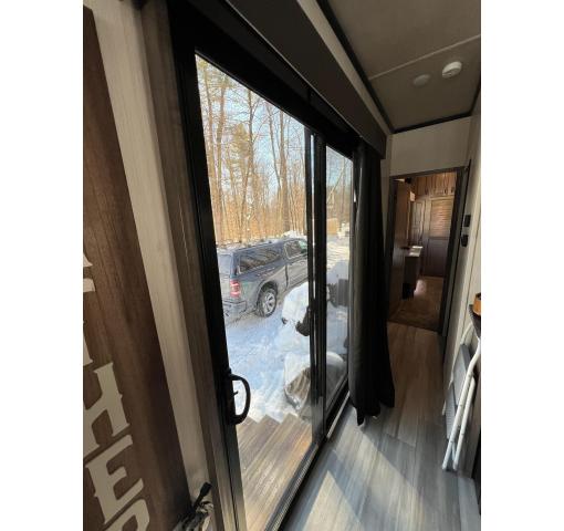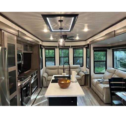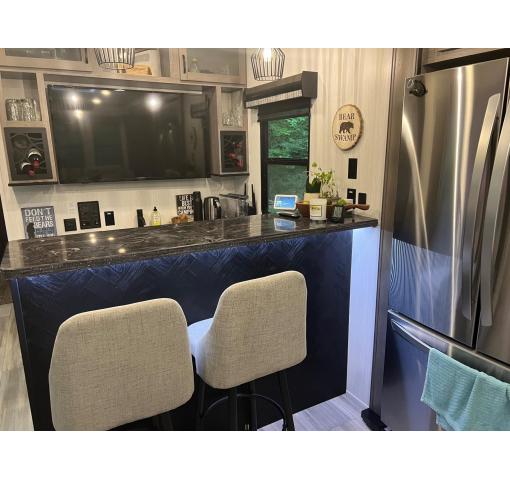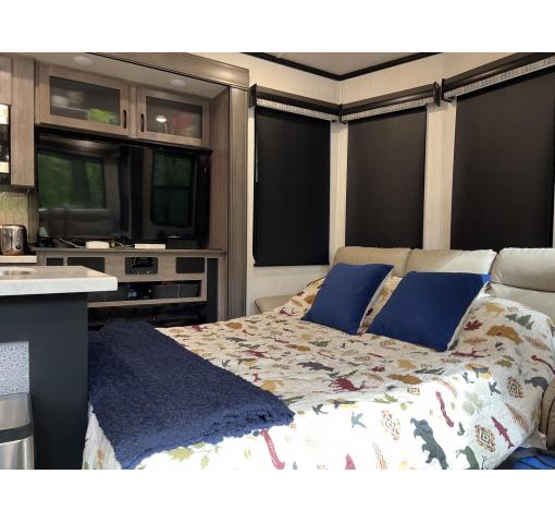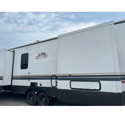 Enjoy your destination in luxury. We have a less than 2-year-old destination trailer in like new shape. We’ve enjoyed it while our home in the Poconos was being built. It’s a great couple's trailer, plus an occasional guest on the pullout queen sleeper sofa with upgraded mattress. In the master suite is an upgraded Queen Westin Heavenly Bed Mattress for the perfect slumber. Kitchen with full sized refrigerator, gas range with full sized oven and over the range microwave. Kitchen island with double sink and great counter space. Did I mention it has a bar with bar sink and bar refrigerator? Yep! Did I mention two 50” TVs in the living area? Yep! There are two power recliners in the living room that are perfect for enjoying the electric fireplace heater and watching a movie. Yes, I said it, an electric fireplace. And a large bathroom that has great space with a large shower with glass doors that don’t attack you when you are showering. 20-gallon electric water heater for long showers and clean dishes. Speaking of cleaning, wait until you use the central vacuum! Very handy. Also, washer dryer connections in one of the many storage areas in the master bedroom. Speaking of storage, there is an amazing amount of storage room throughout. From the floor to ceiling pantry with pullout shelves in the kitchen, to the closet in the bathroom and the massive amounts of storage throughout the master bedroom including a 4-drawer dresser with a secret compartment (Shhh!). Don't forget, the bed lifts up for even more storage. Wow! And the windows wrap around the living area to make it seem like your outside. And waking up to a beautiful view looking out the huge window in the master is always a pleasant time. A sliding door to the kitchen area and separate entry door to the master bedroom. A/C in the master and a 2nd A/C in the main living area keep this Cottage nice and cool in the summer. Or open the many windows and let the 2 ceiling fans circulate the cool summer evening air. Central propane furnace heats it nicely in the cool fall mornings. An electric heater in the bedroom to take off the chill. Pickup your dream vacation home before it is gone. This RV is in excellent condition. The only thing that needs attention, the awning needs a good cleaning, and I would generally do a good roof scrubbing in the spring. Also, we modified the bed platform from a King down to a Queen. But it could easily be modified back to a King.