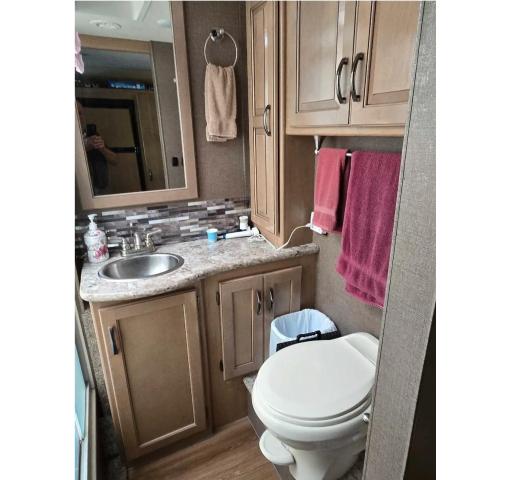 The kitchen is fully equipped with a convection microwave, induction and gas stove, and plenty of counter space for meal prep. A full all-in-one bathroom includes a porcelain toilet and modern finishes for a true home-on-the-road feel.