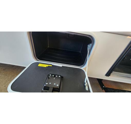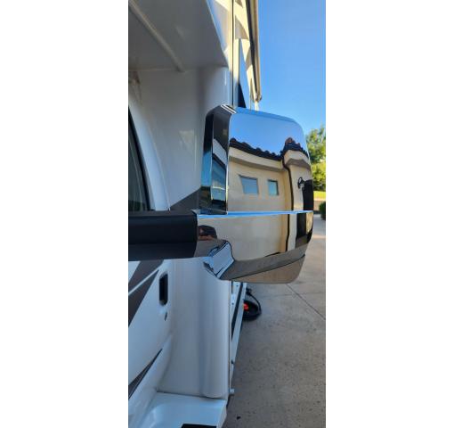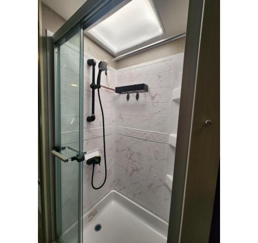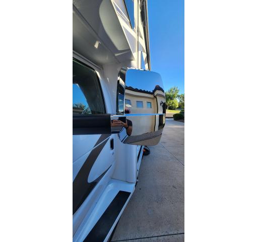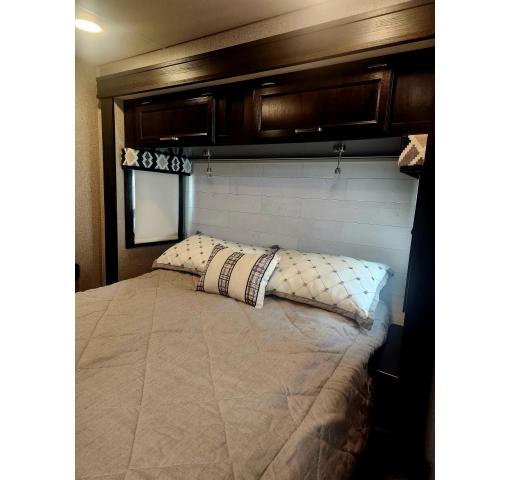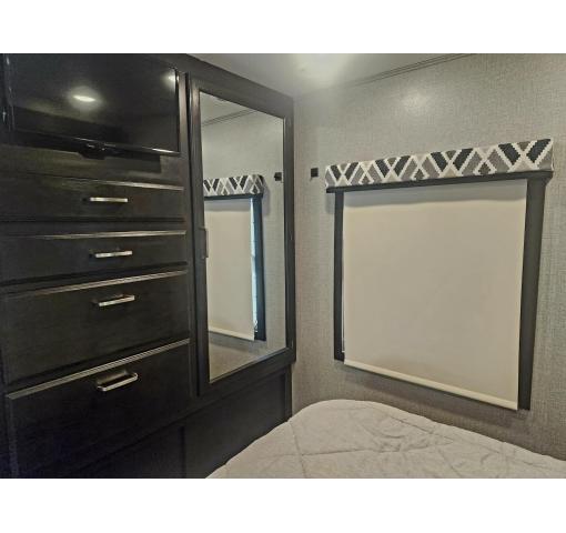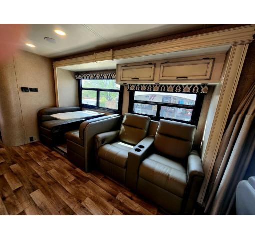 A privacy door separates the 36" glass enclosed shower with an overhead skylight and the bathroom has plenty of cabinet and storage space. The slide master bedroom has dual mirrored wardrobes and built in dresser drawers. The overhead cabinets provide additional storage space and dawn reading lights above the full walk around queen mattress. There is also additional storage capability inside above the theater seats, above the cab, and under the dinette seats.