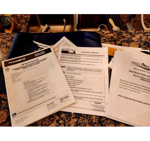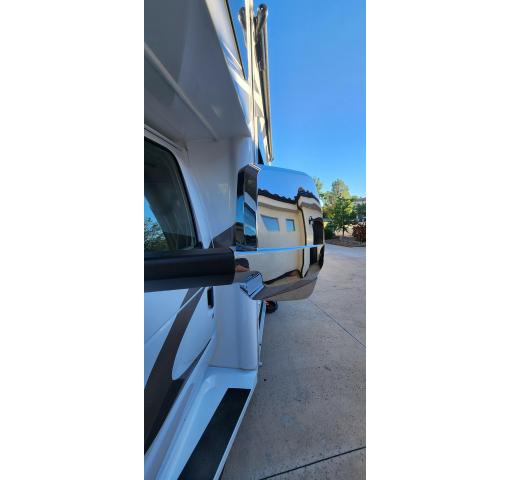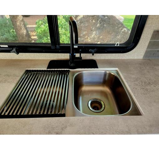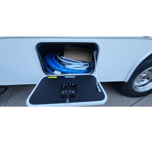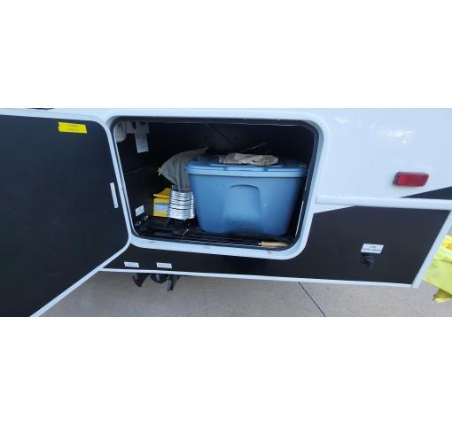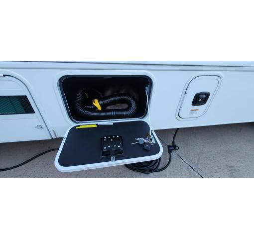 Additional items included are 30ft. electrical extension cord (30amp), Surge Guard, sewer system equipment, water hoses (both hot and cold season), and outside carpet. Also, Queen bed sheets and comforter, towel set, custom stove top cover, closet organizer bins, broom & dust mop, shower organizer, toaster, bowl set (3), eating utensils, TV cable, plate set and bowls (8), cutting board, sink strainer cover, and outdoor trash bin.