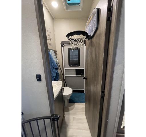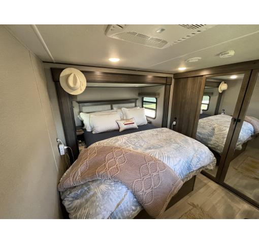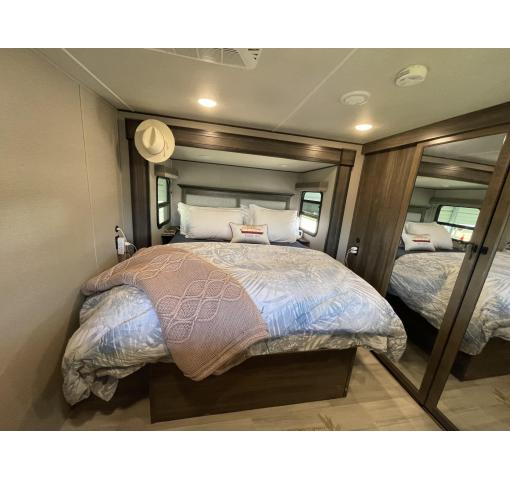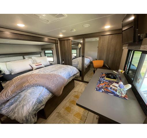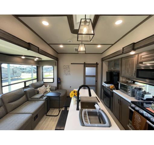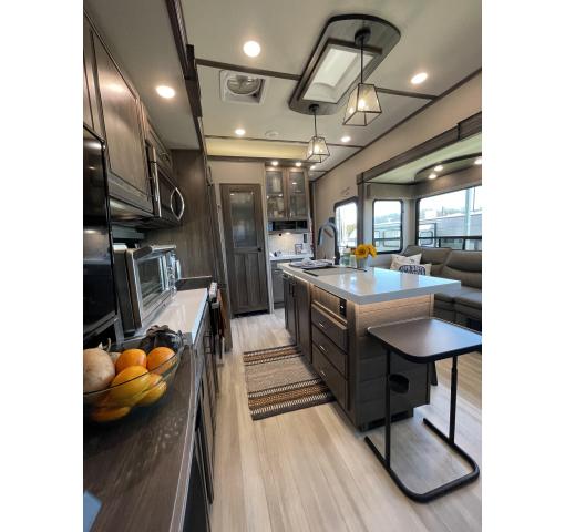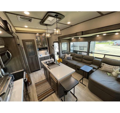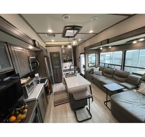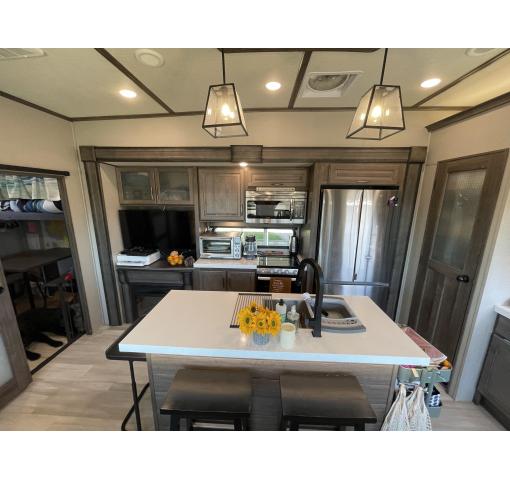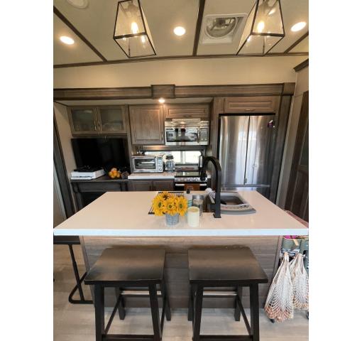 Exterior features of this 2021 Solitude 3740BH-R 5th Wheel by Grand Design include: automatic leveling, propane generator, wiring for rear camera, outdoor kitchen with fridge, sink & grill, upgraded dual pane windows, cold weather package, 2 entrances, awnings, slide covers, and lots of storage. Upgrades & luxury details greet you as you enter inside. With this floorplan the master bedroom & master bath with shower is private from the rear bunkhouse with a half bath included. The large master closet includes a separate washer and dryer and ample storage. The queen bed with support platform and new mattress lifts for storage underneath. Large windows with upgraded pull down shades offer views, natural light and privacy. The dresser top has been converted to a desk that can be removed. Enter into the living room kitchen area featuring fireplace, flatscreen TV, stylish overhead lighting, skylight, stadium seats with attachable tables and a chaise lounge. The kitchen island offers prep space as well as addition room to dine. The large pantry, full fridge, convention oven/microwave & gas range make this feel like your kitchen at home. The sofa in the living room and bunk house can be converted for sleeping as well accommodating 10 people in the whole RV. The rear bath is accessible directly from the exterior, ideal for camping and adventures. This coach features the convenience of technology with LED interior and exterior lighting, speaker system, Bluetooth capability, touchpad controls by the front door. Family, as well as guests, will love the intuitive layout and abundance of creature comforts.