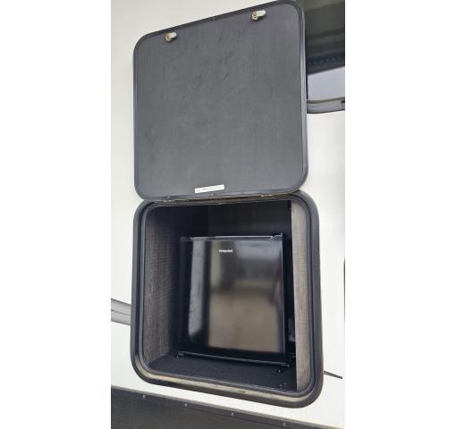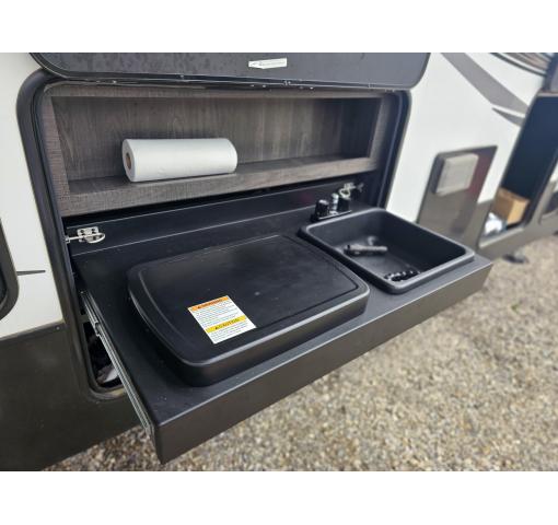 back of trailer folds down, has exterior fold out fence for perimeter, with steps for easy walkup, tv mounted outside, small fridge, and a pull-out area with small gas griddle and sink.