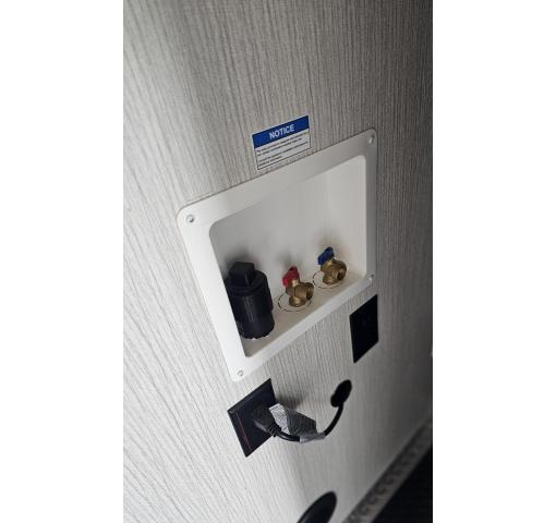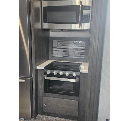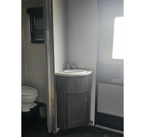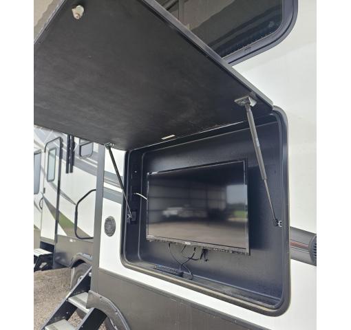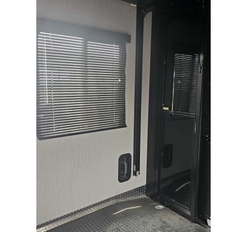 Toy hauler has a half bath. In toy hauler area there are 2 couches that can be folded out to make one bed, and also a bed above the couches. Sliding glass doors open out onto the back porch area. A TV is mounted on the wall. There is also a washer dryer hookup.
