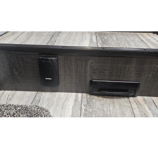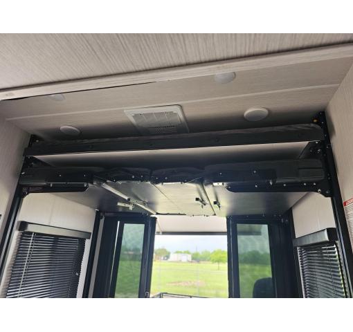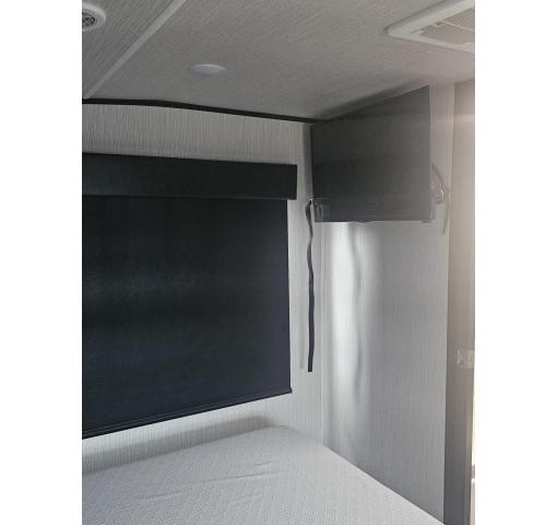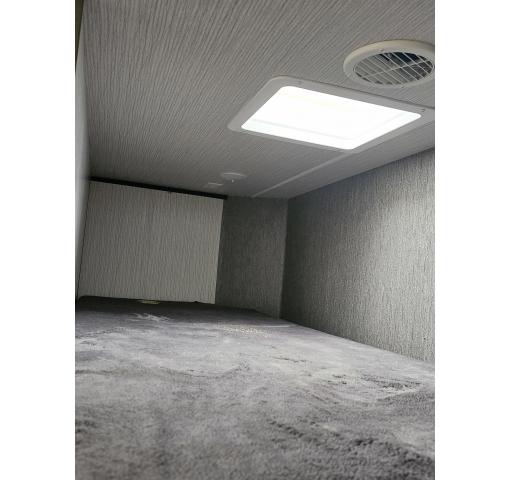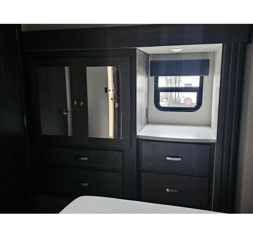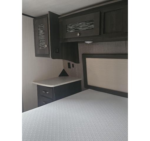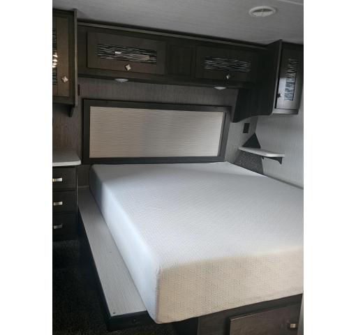 Main bedroom has carpet, plenty more storage above and below bed as well as the closet and drawers. Mattress in a RV queen or queen, bought after, much better quality. TV Mounted to wall.
