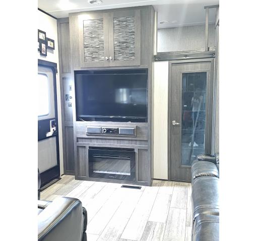 Living area contains brown leather couches, 3 areas of the couches recline, light up cup holders with usb plugs. There is a loft in living area, sleeping 1 person comfortably, access is with a ladder that can easily be put up and taken down. TV mounted above an electric fireplace. Radio sits just below tv. Grey vinyl flooring throughout.