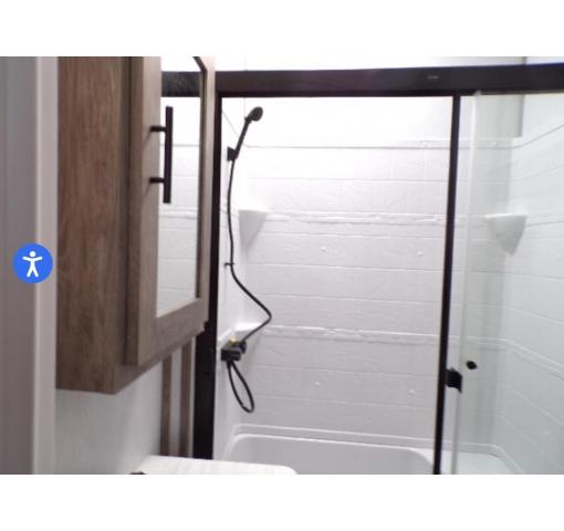 Residential Walk In Shower, Porcelain Toilet And Vanity