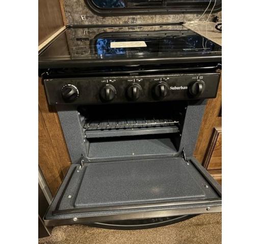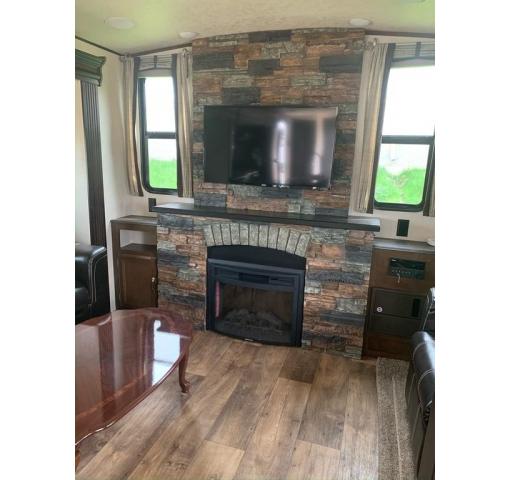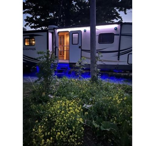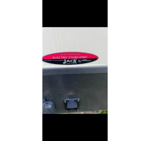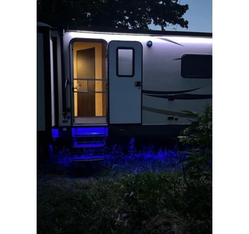 On the outside there is a large pass through storage compartment up front for all of your outdoor camping gear, plus so much more! Outdoor speakers and LED lights light up the awning and underside in blue lights. Set up for solar panel hookup. Husky heavy duty tow hitch, leveling bars and sway bar . Upgraded insulation .