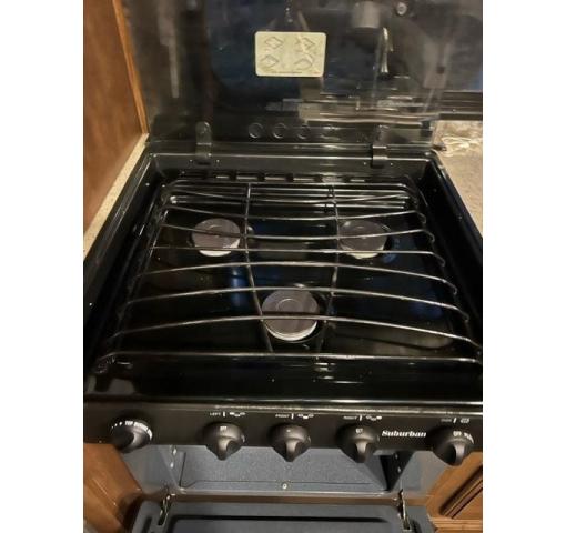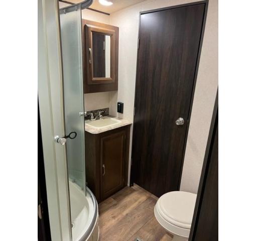 To the left of the main entry door you will find a nice kitchen area for food prep and cooking. There is a slide out refrigerator, a three burner range, an L-shaped Quartz counter, and microwave oven all within a large slide out that also includes a tri-fold sofa. You will also find a nice size pantry opposite the refrigerator for your canned and dry food storage needs, plus there is space for your daily dishes and other kitchen items in the cabinetry. There is a large sink found in the L-shaped counter that faces out so that you can be part of the conversation inside while cleaning up after a meal.