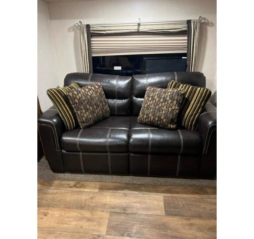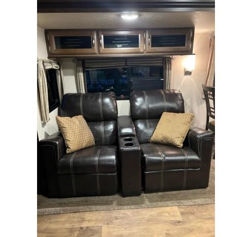 Along the road side you will find a second slide out that includes a jumbo dinette and theater seating for two. This is adjacent to the rear full wall entertainment center with fireplace, and storage. You can easily gather here with family and friends thanks to all of the seating provided.